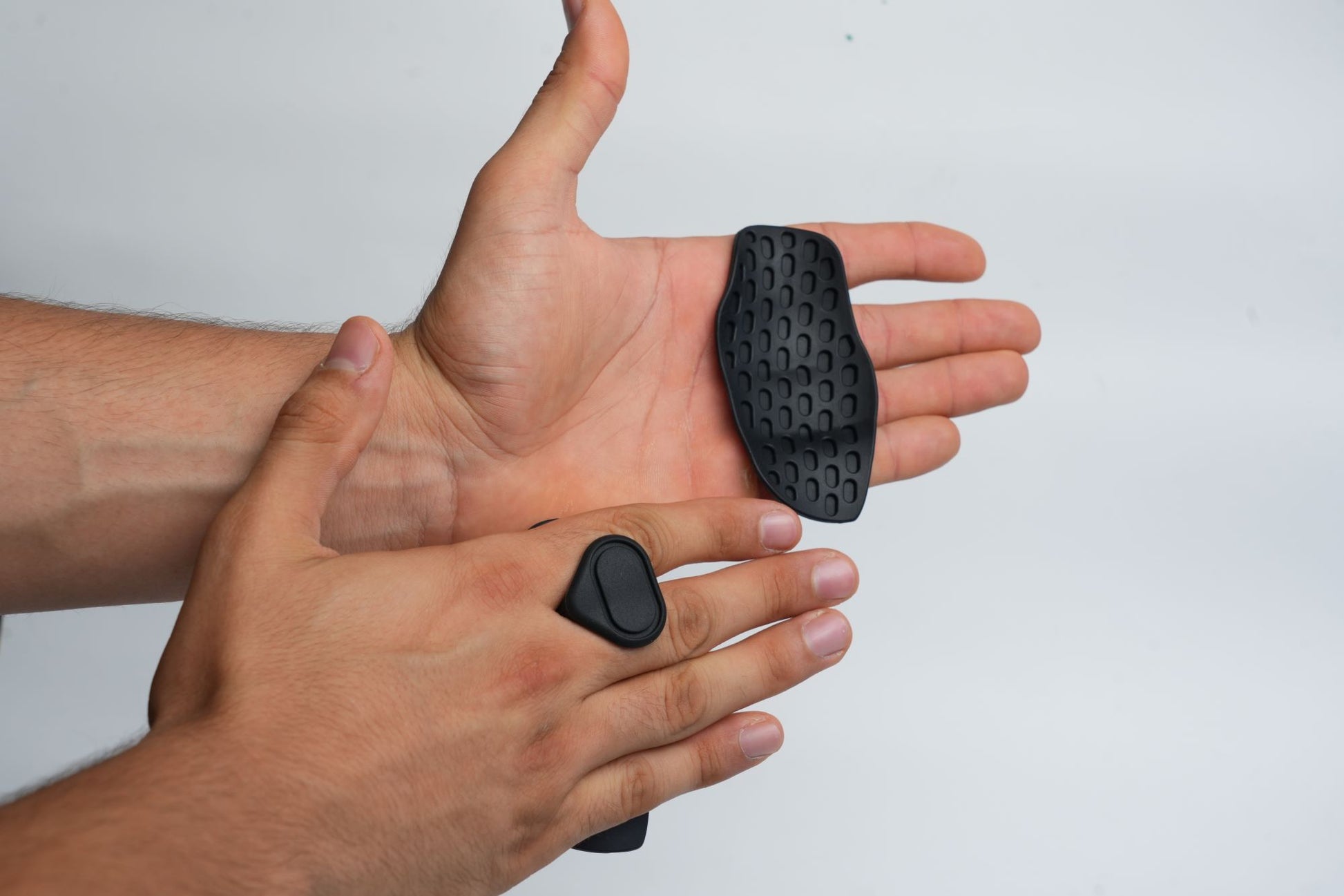 A gym grip support accessory designed to improve grip, reduce hand strain, and prevent calluses during weightlifting. It features a non-slip surface, no sweaty hands, ergonomic shape, and comes with a protective carrying case.